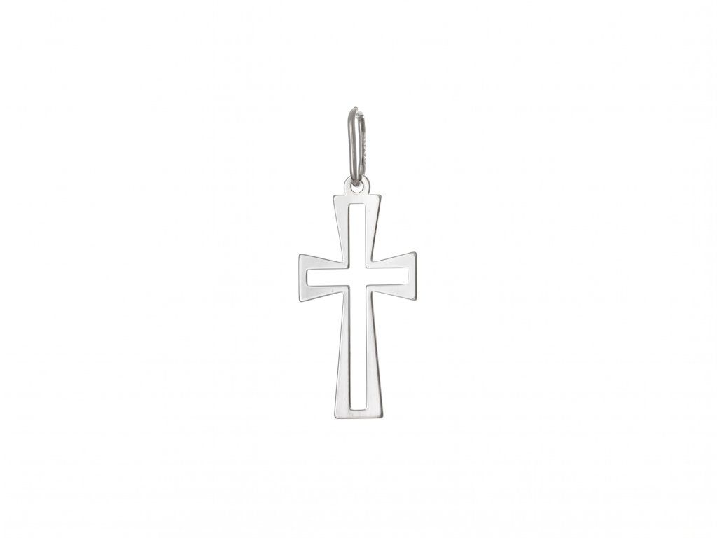 Jemný stříbrný přívěsek ve tvaru otevřeného obrysového křížku, jehož ramena se směrem k okrajům lehce a elegantně rozšiřují.