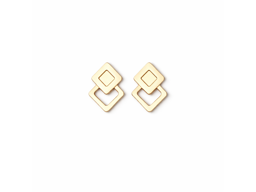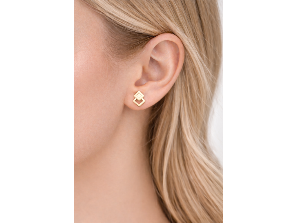 Stylové náušnice s geometrickým motivem představují dokonalou rovnováhu mezi elegancí a moderním designem. Dominantním prvkem jsou dva propojené čtverce – jeden plný a druhý otevřený – které vytvářejí zajímavý vizuální efekt a jemný pohyb při nošení.