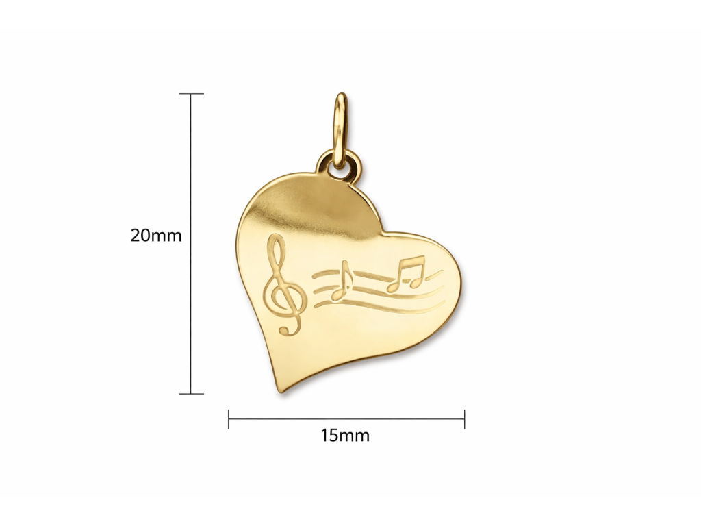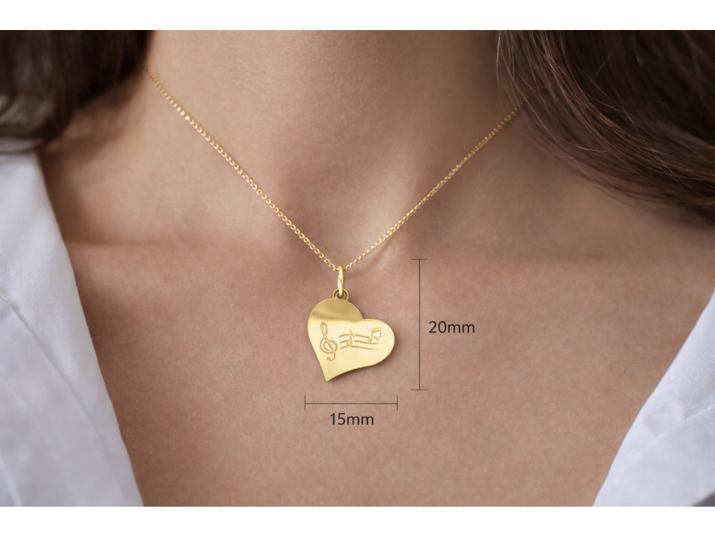 Vyjádřete svou lásku k hudbě šperkem, který mluví za vás. Tento přívěsek ve tvaru moderního, jemně prohnutého srdce je vyroben ze žlutého zlata s vysokým zrcadlovým leskem. Dominantou šperku je detailní rytina houslového klíče a notové osnovy, která symbolizuje harmonii a životní vášeň.