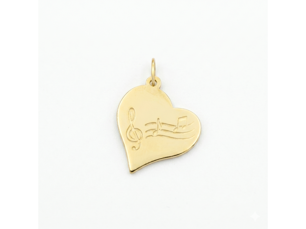 Zlatý přívěsek Srdce s houslovým klíčem Elegantní přívěsek ve tvaru asymetrického srdce z 14karátového žlutého zlata, zdobený precizním rytím houslového klíče a not. Dokonalý dárek pro každou milovnici hudby, který v sobě spojuje romantiku a uměleckou vášeň.