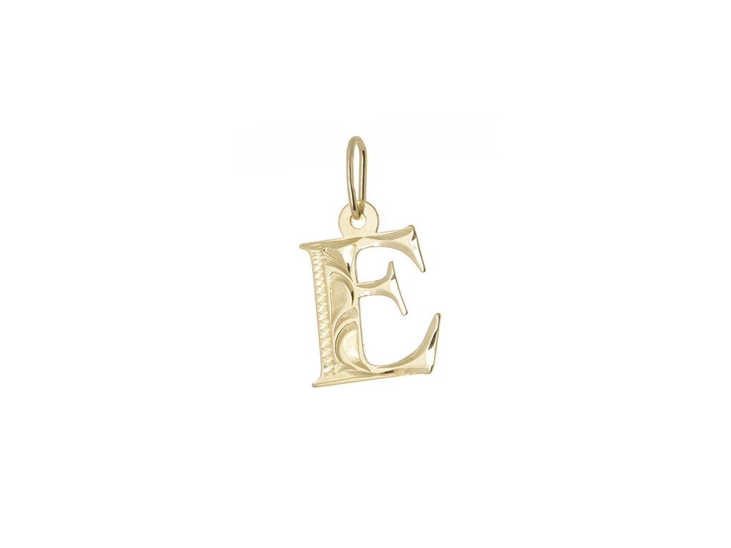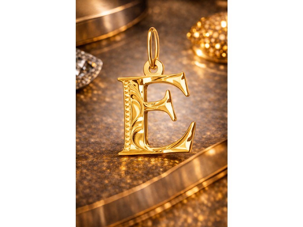 Elegantní zlatý přívěsek ve tvaru písmene E, jehož čelní strana je precizně zdobena zářivou rytinou.