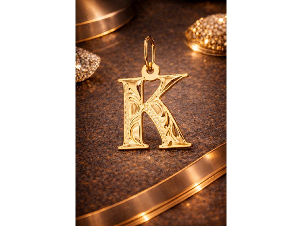 Elegantní zlatý přívěsek ve tvaru písmene K, jehož čelní strana je precizně zdobena zářivou rytinou.