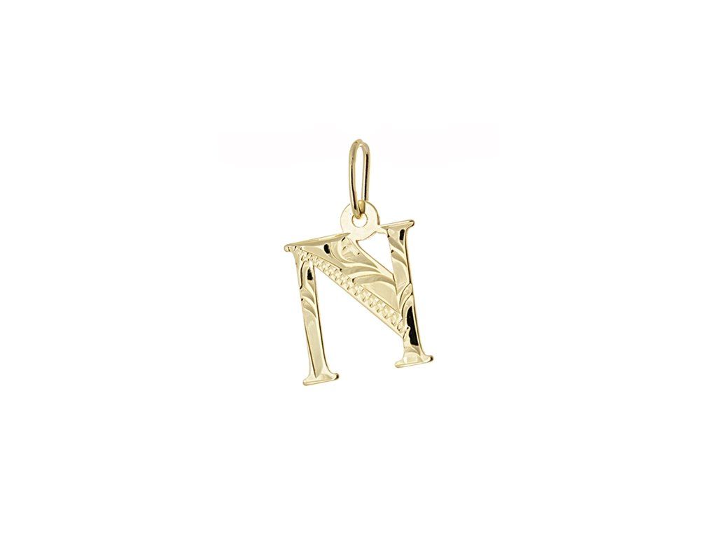 Elegantní zlatý přívěsek ve tvaru písmene N, jehož čelní strana je precizně zdobena zářivou rytinou.
